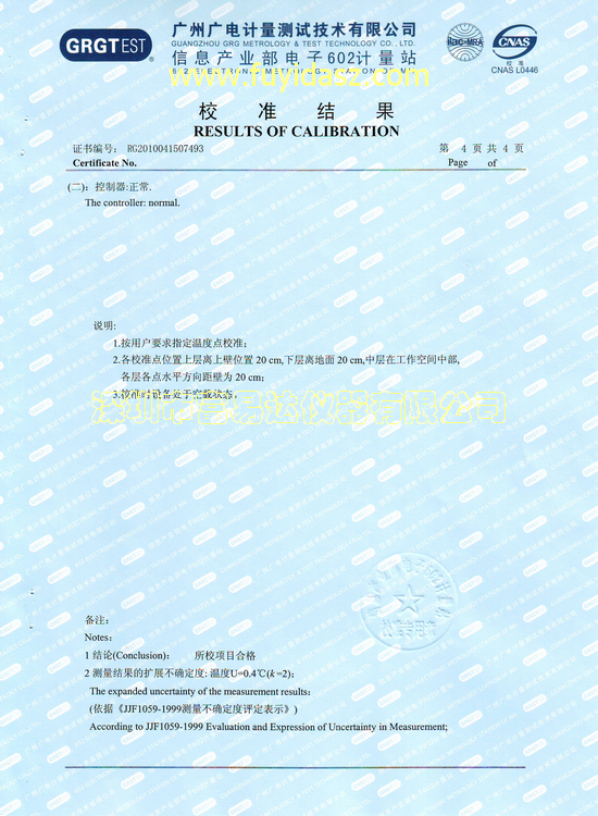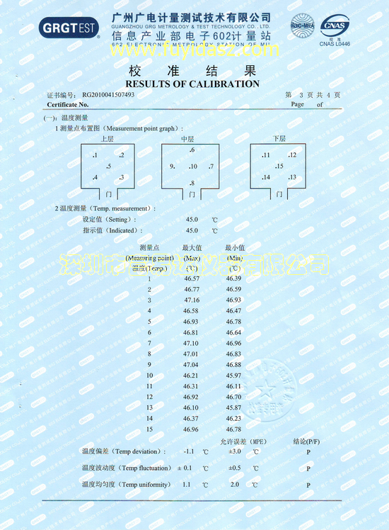 在無故障長時間不停機試運行45天以后,由客戶(廣電運通)指定第三方測試單位(信息產業部電子602計量站)組織驗收。正式2010年9月13日,一次性成功通過第三方驗收,附校準測試報告。此次驗收比較特殊,由于國家目前沒有關于老化房的相關的驗收標準,信息產業部電子602計量站就按照環境試驗設備的布點要求和測試方法,依據“高溫老化試驗箱”的溫度要求,完全按照“JJF 1101-2003《環境試驗設備溫度、濕度校準規范》”進行驗收。