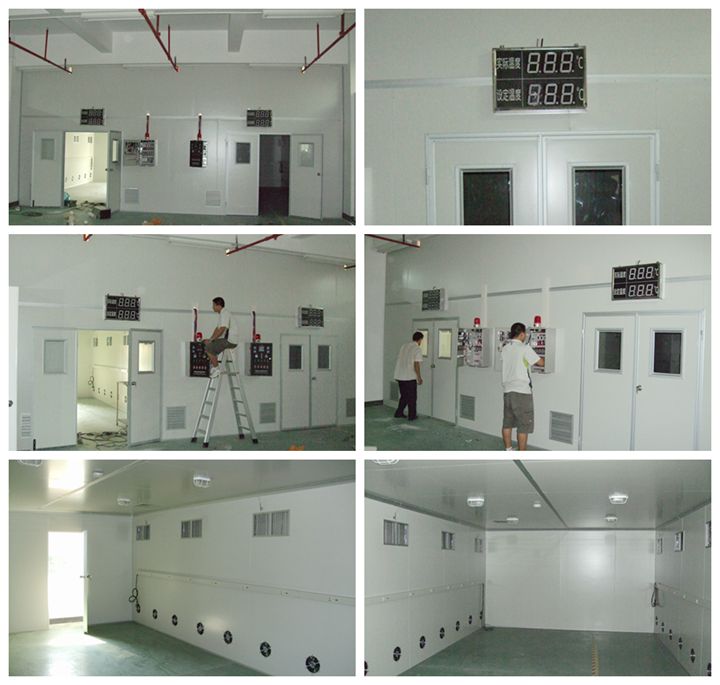 1、庫(kù)體五面采用雙面彩鋼保溫庫(kù)板(EPS 計(jì)算機(jī)色)拼裝而成,地面不做處理,接合處打密封玻璃膠,有效保證房間的密封性,室內(nèi)放置產(chǎn)品老化車。