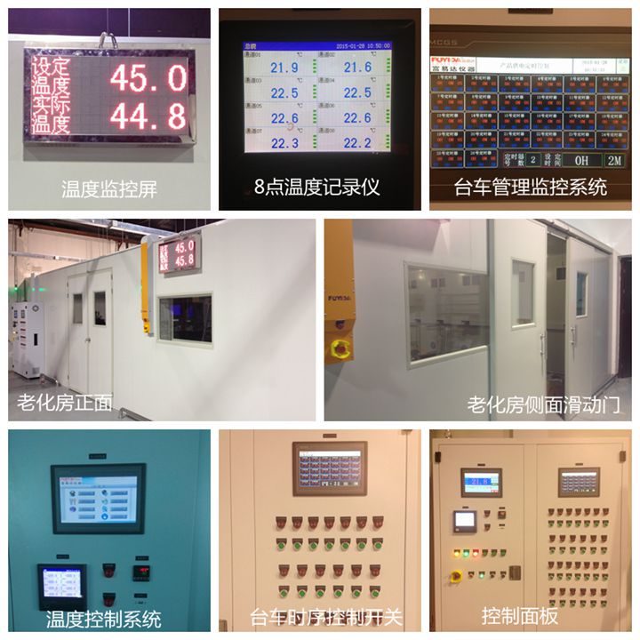 b、控制部件:觸摸屏 + PLC + 溫度模塊 + 控制軟件 c、遠程溫度控制(溫度監控或者停機)(不含溫度記錄儀的傳感器狀態) 8.20、溫度控制方式: a、PID為控制核心,通過過繼電器實現自動控制功能 b、采用獨立溫度超溫保護控制系統 c、時間單獨控制 8.21、溫度檢測: a、室內1點溫度檢測、1點超溫保護檢測、8點溫度監控(整個老化房共布置10個溫度測試點) b、排風采用獨立手動操作,以防止因外部原因造成排風系統癱瘓 |
